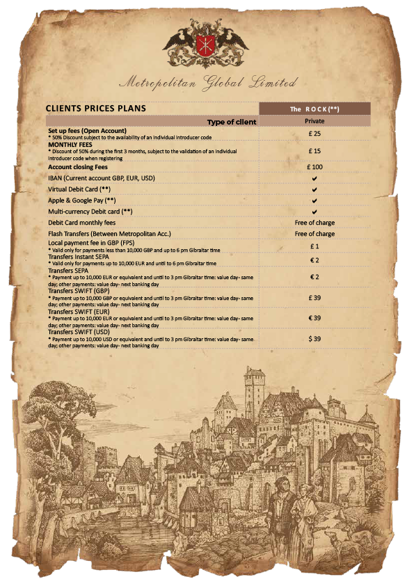 For both individuals and legal entities, tax residents covering a range of 5 continents, we offer the “METRO” client package, your personal accounts to make payments in three different currencies (GBP, EUR and USD). You can also apply for personal & corporate debit cards managed from your Metropolitan app.