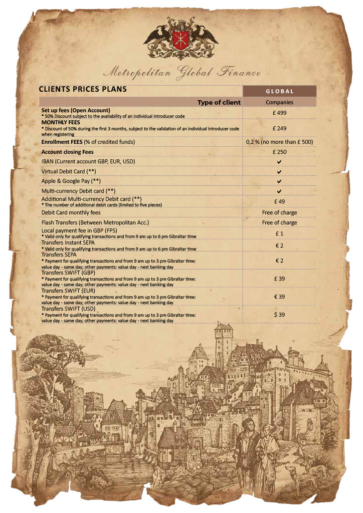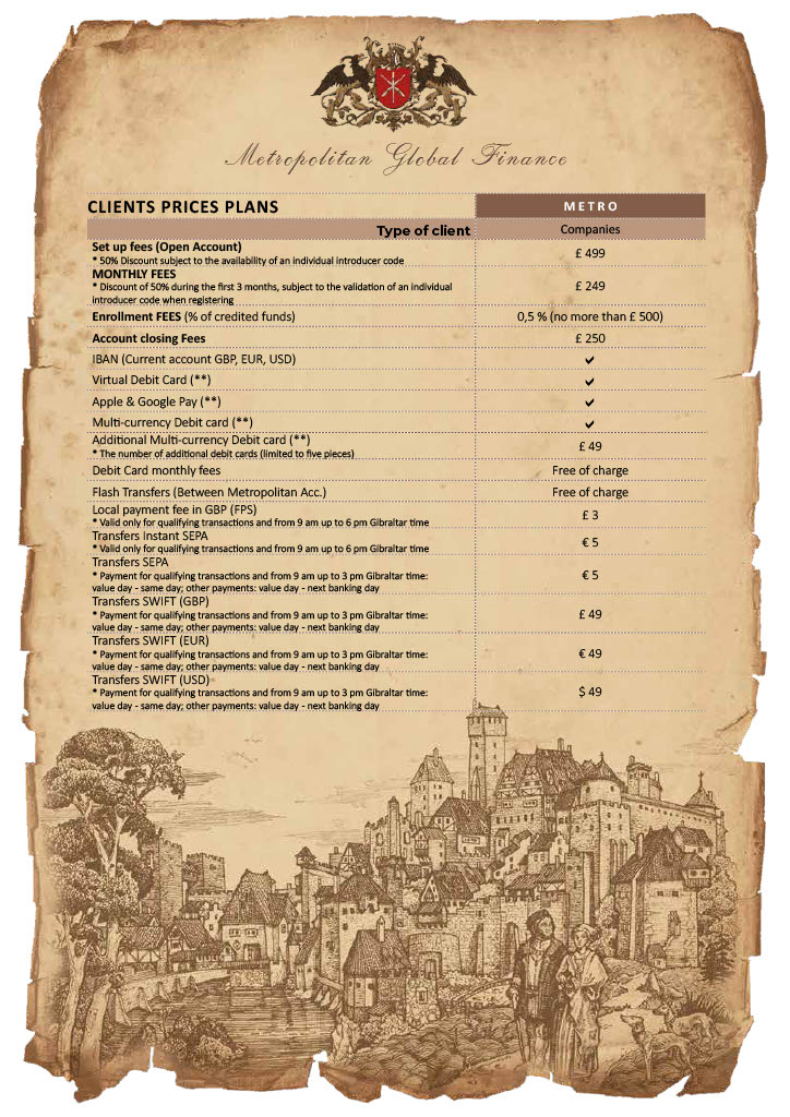 The specified client package can be applied for by legal entities, corporations and supervised financial professionals active in trading or brokerage transactions with a required minimum number of 5 incoming payments per month. If the account is not active for a period three months in a row, or that the type of client’s commercial activity changes, Metropolitan has the right to unilaterally transfer this client package into “METRO” plan package.